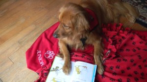 At 11 months old, Junior was in a shelter. DFWMetro Golden Retriever Rescue rescued him, and his given rescue name was George. I jokingly called him George Jr when we adopted him, and it stuck. He gave us fifteen years of love and service. He worked hard and became a registered therapy and reading education assistance dog. Junior’s therapy niche was reading with kids in libraries, healthcare settings, and domestic violence shelters. He started a reading program for kids at a literacy center. When he retired from therapy work, he became my writing muse and inspiration for our blog, The Daily Junior, which won a Dog Writers Association Maxwells award for best blog.